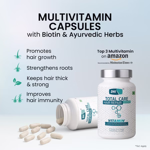 DHI Multivitamins are made with Biotin, Amino Acids, and Ayurvedic herbs. Combining these ingredients, our multivitamin capsules provide comprehensive support to address various hair fall issues, resulting in stronger, healthier hair and reduced shedding.